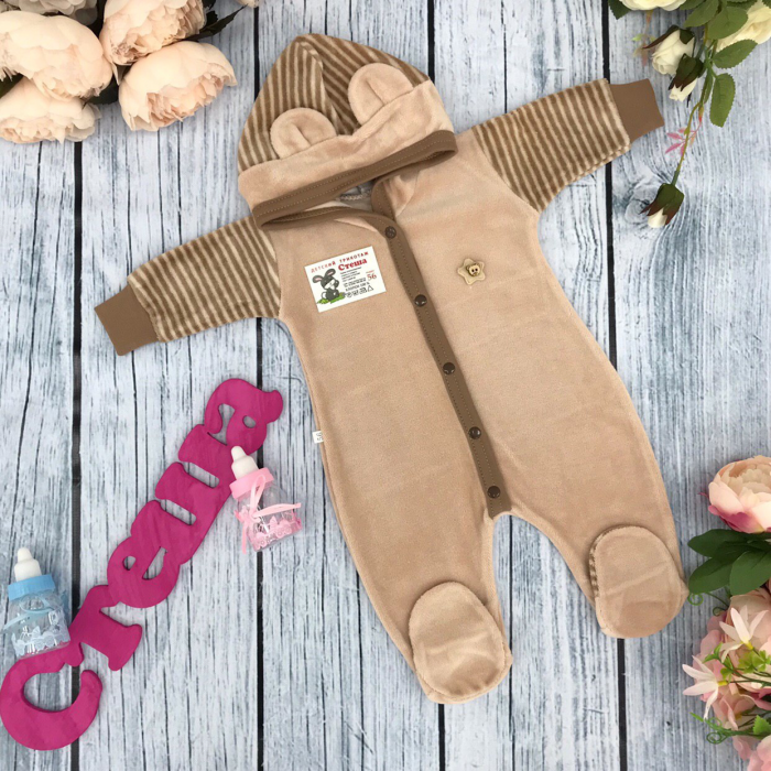 Теги: Купить велюровый комбинезон оптом от производителя. 225. Комбинезон с шапкой, 80% хлопок велюр, 20% ПЭ 56,62,68,74 цена,отзывы официальный сайт "Стеша Ярославль"