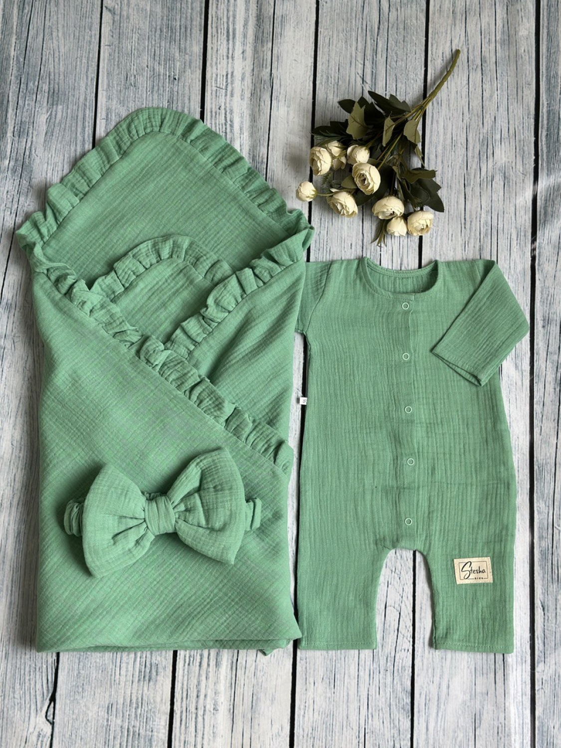 335-ОЛ. Комплект из детского комбинезона, р 56 и конверта муслин, хлопок 100% 90/90 см, олива